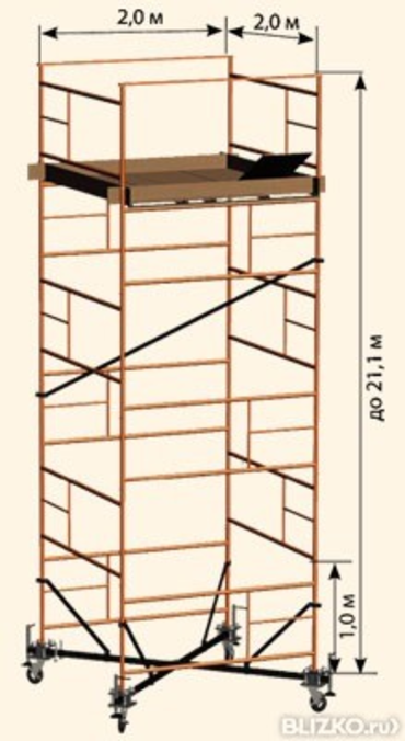 Вышка «Атлант» (пр-во РИНСТРОЙ, г. Москва). Высота вышки — до 21м с шагом 1м, размеры площадки — 2,0х2,0м. Предназначена для отделочных, монтажных и фасадных работ. Изготовлена из тонкостенной стальной трубы 42х1,5мм с порошковой окраской.